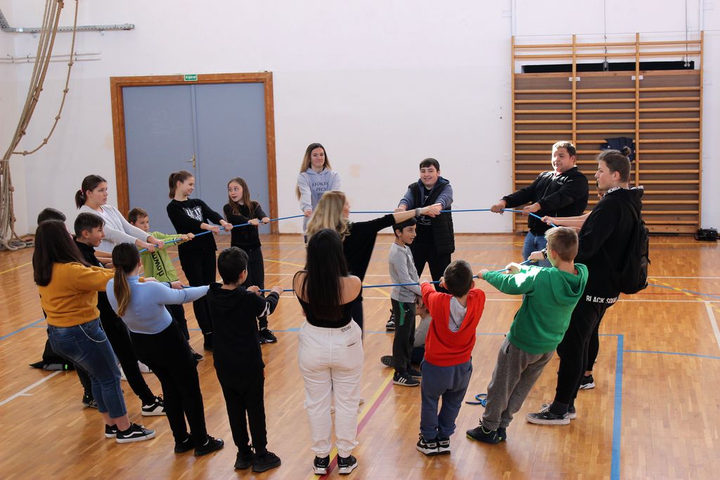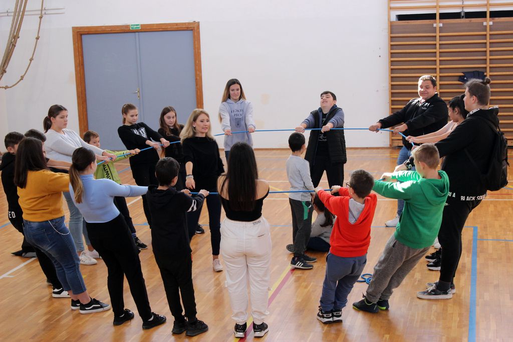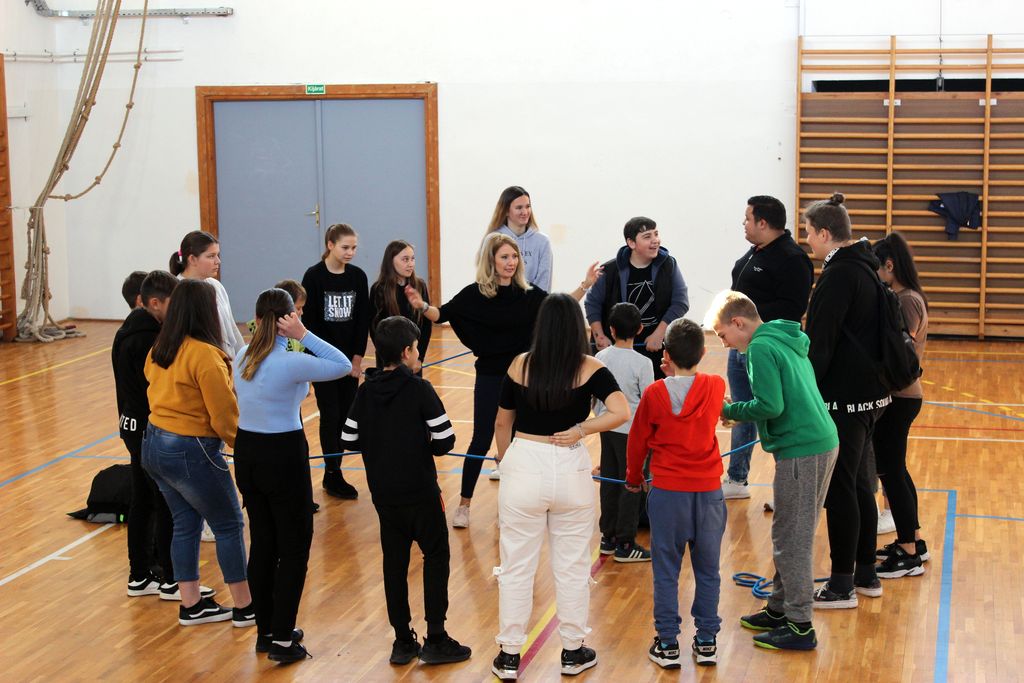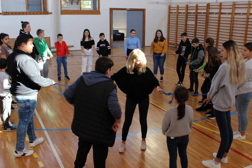 A rendezvény következő részében a közösségépítésen volt a hangsúly. Az alkalmazott kötéltechnika olyan rejtett együttműködési és kooperatív mechanizmusokat hozott elő a gyerekekből, amely megmutatta számukra, hogy mi mindenre is képesek, ha gyors és koncentrált feladatmegoldásra van szükség. Együttes erővel, közösen, összefogással látványos eredmény érhető el, s a mostani esetben is a „kötéltáncos” stabil és biztonságos közegben érezhette magát. A jelenlévőkből alkotott csoport egymásért felelősséget vállalva bebizonyította, hogy bízva egymásban, hittel és egy kis erőbedobással „senki sem fog padlót”.