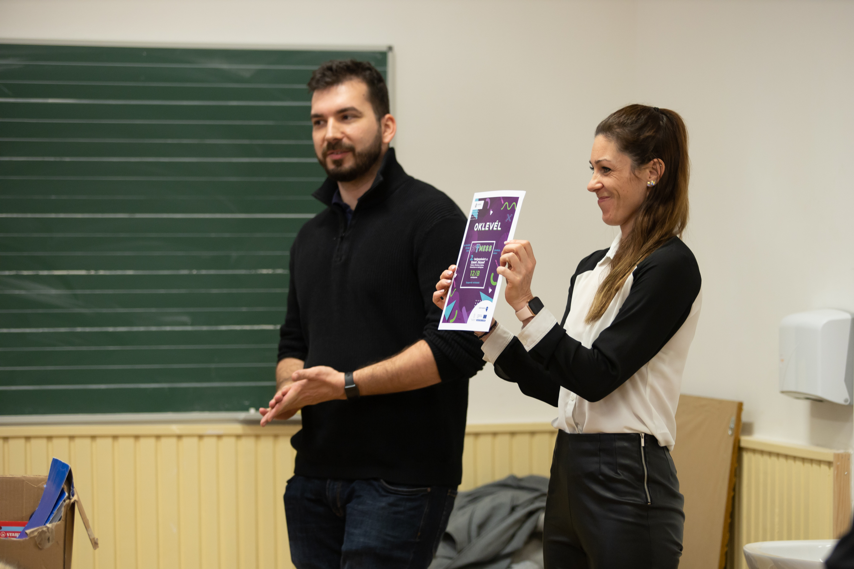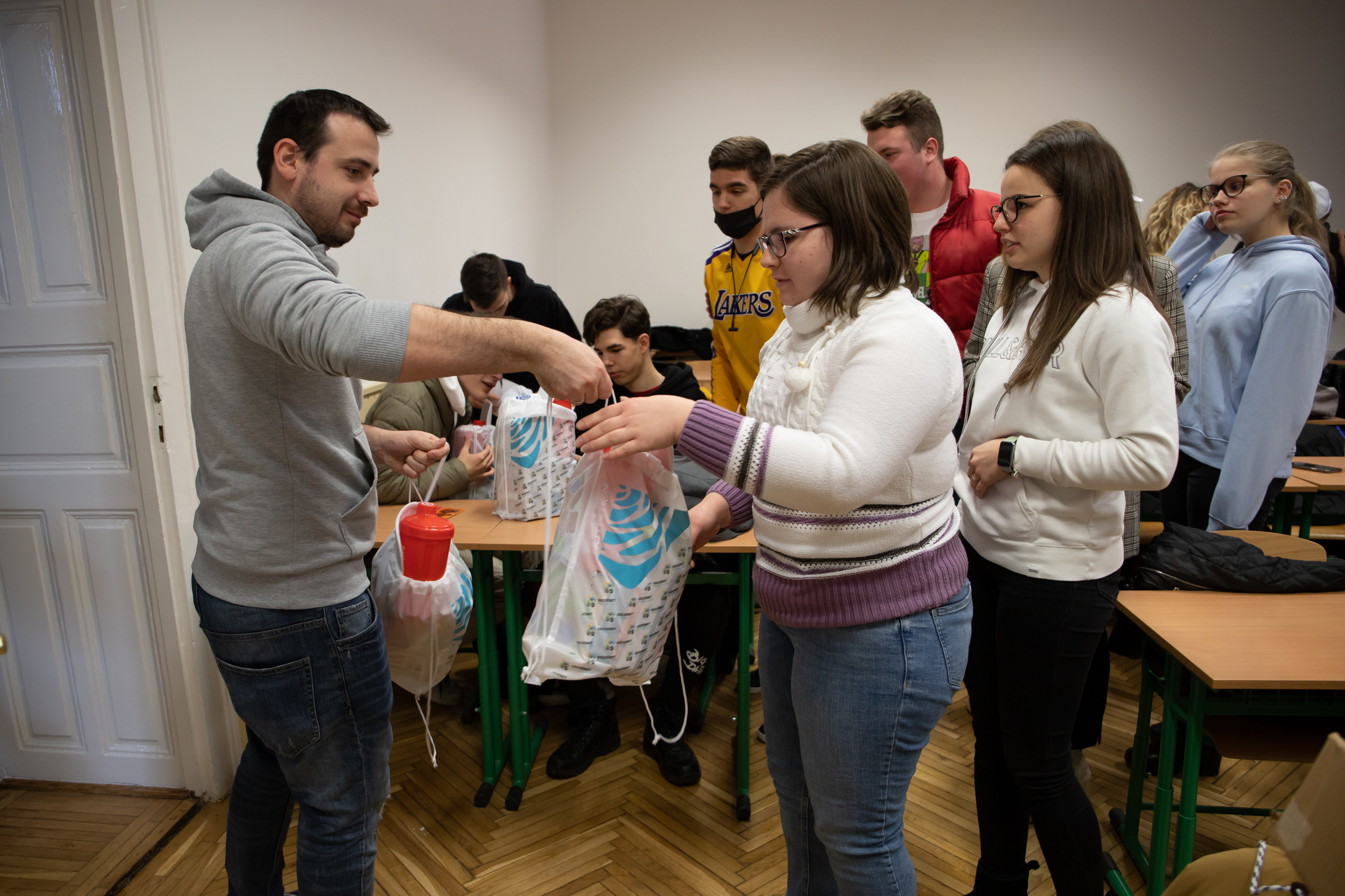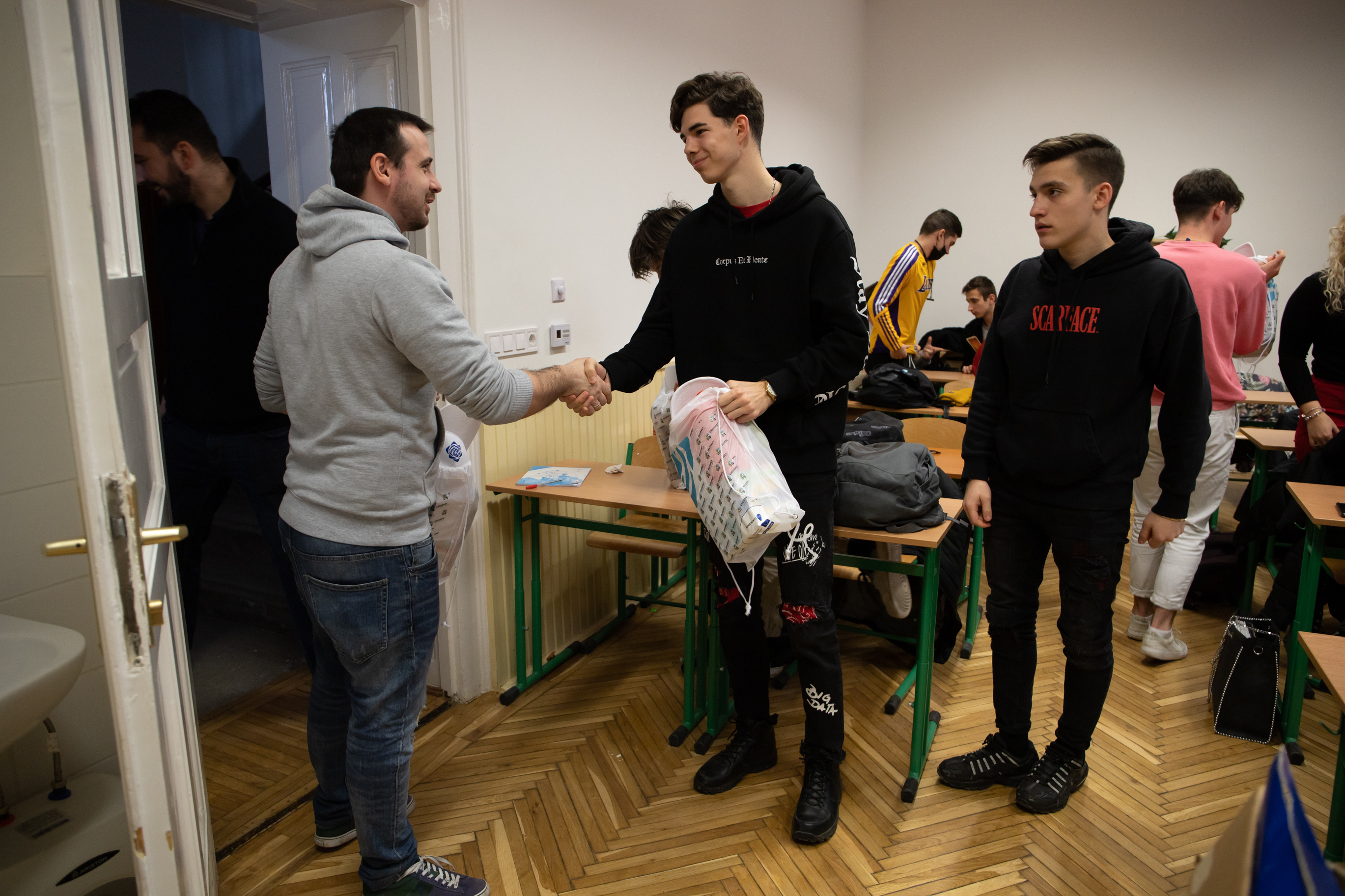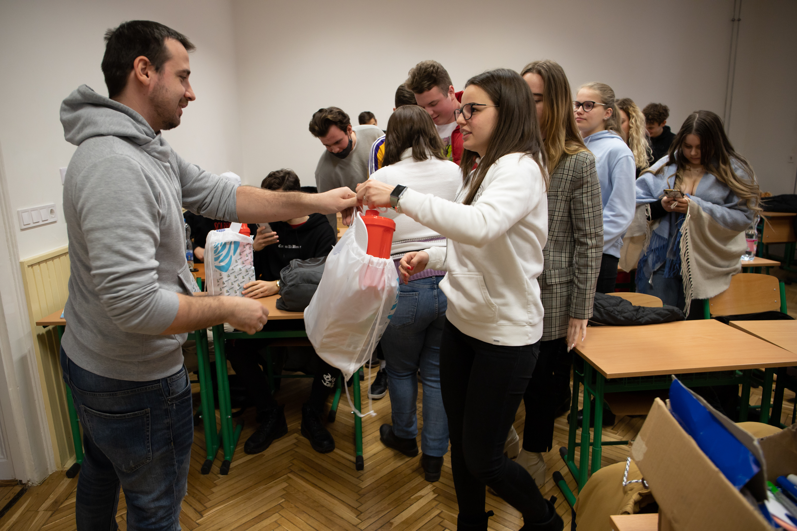 A tanóra végéhez közeledve egy díszes oklevél kíséretében az osztály minden tagjának kiosztottuk az ajándékcsomagokat, melyeket a támogató partnereink (Scitec Nutrition, Abonett, Spar) jóvoltából csupa hasznos, egészséges és finom termékkel tudtunk megtölteni. A remek hangulatú találkozót egy csoportkép elkészítésével zártuk, mely ékesen bizonyítja, hogy a csomag tartalma pozitív fogadtatásra talált.
