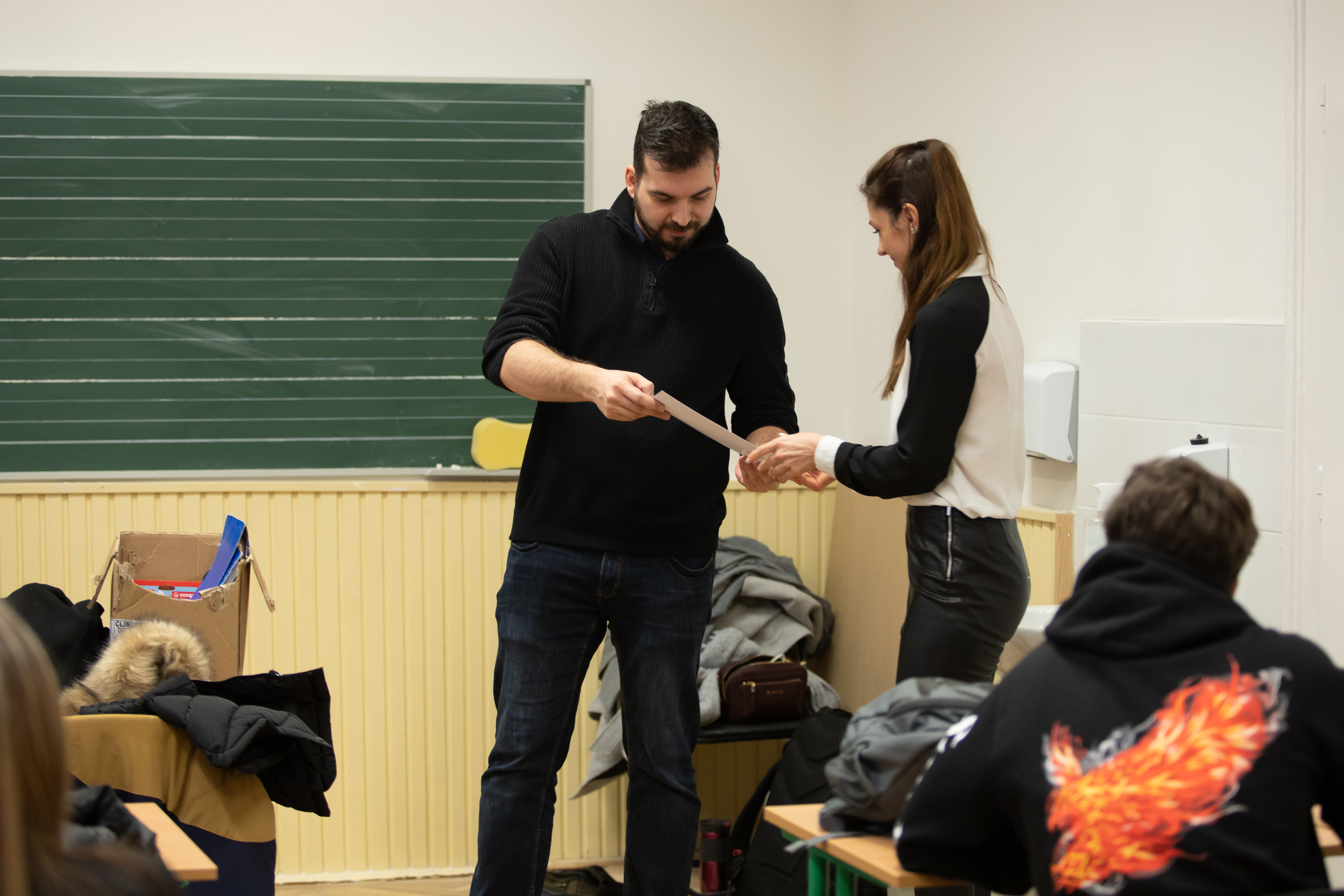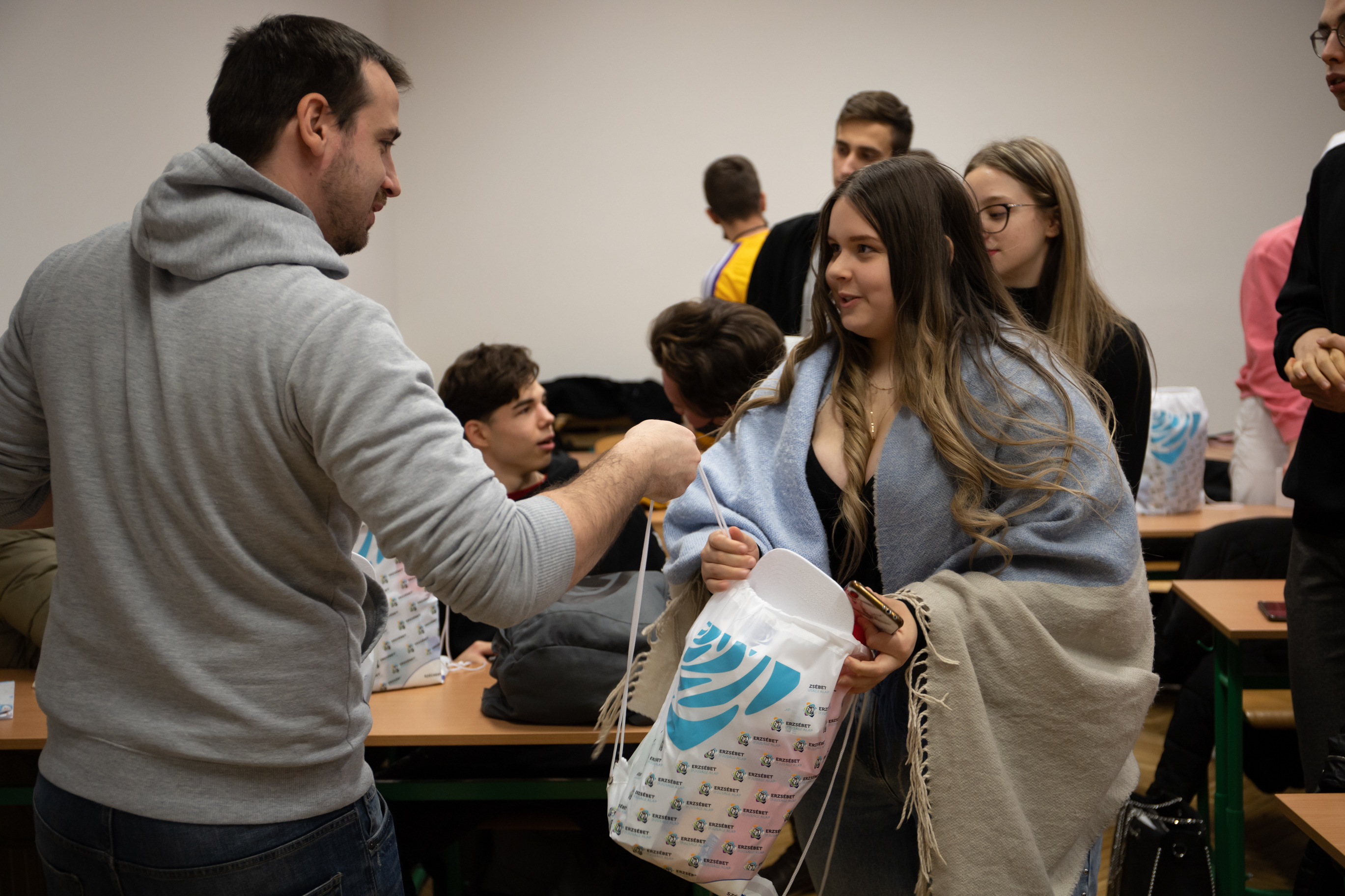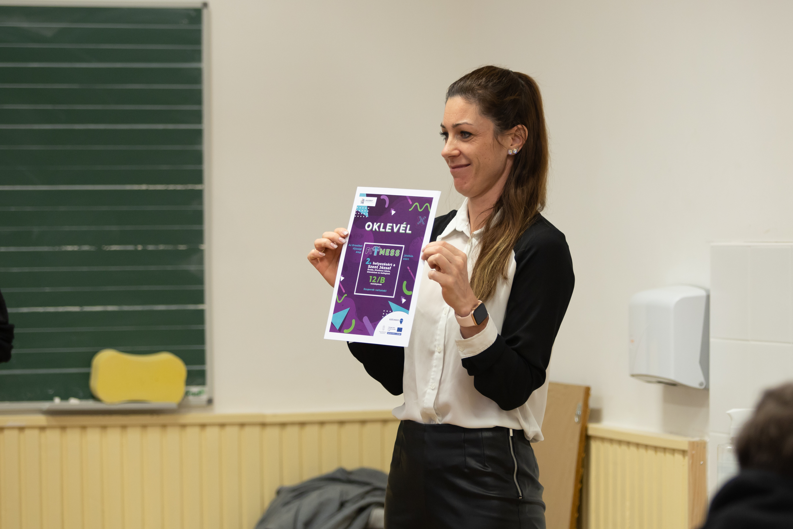 A tanóra végéhez közeledve egy díszes oklevél kíséretében az osztály minden tagjának kiosztottuk az ajándékcsomagokat, melyeket a támogató partnereink (Scitec Nutrition, Abonett, Spar) jóvoltából csupa hasznos, egészséges és finom termékkel tudtunk megtölteni. A remek hangulatú találkozót egy csoportkép elkészítésével zártuk, mely ékesen bizonyítja, hogy a csomag tartalma pozitív fogadtatásra talált.