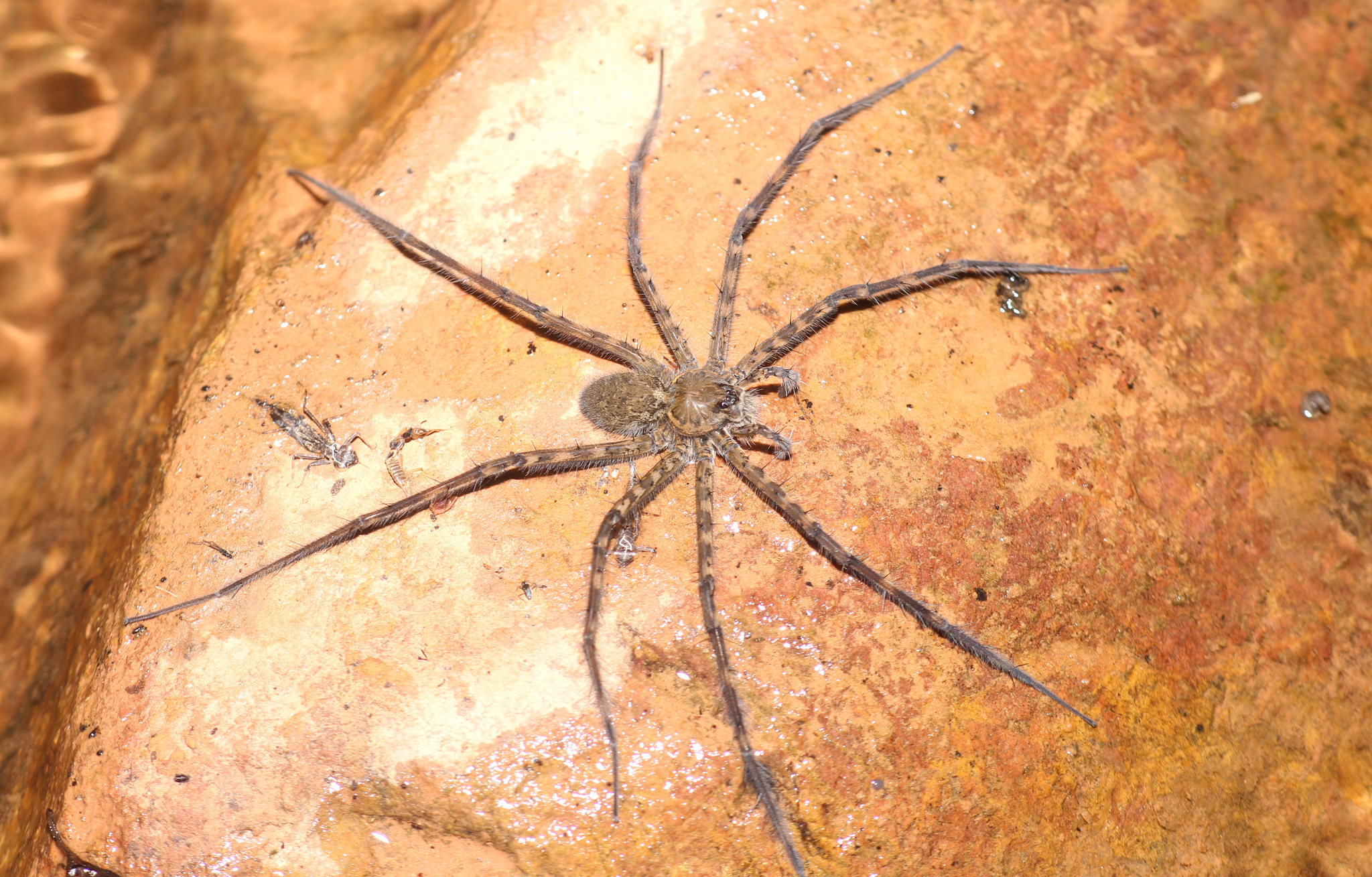 A Trechalea extensa a vízparti köveken, farönkökön várja zsákmánya rezgéseit, amelyeket a vízfelszínre nyújtott elülső lábaival érzékel. Forrás: INATURALIST